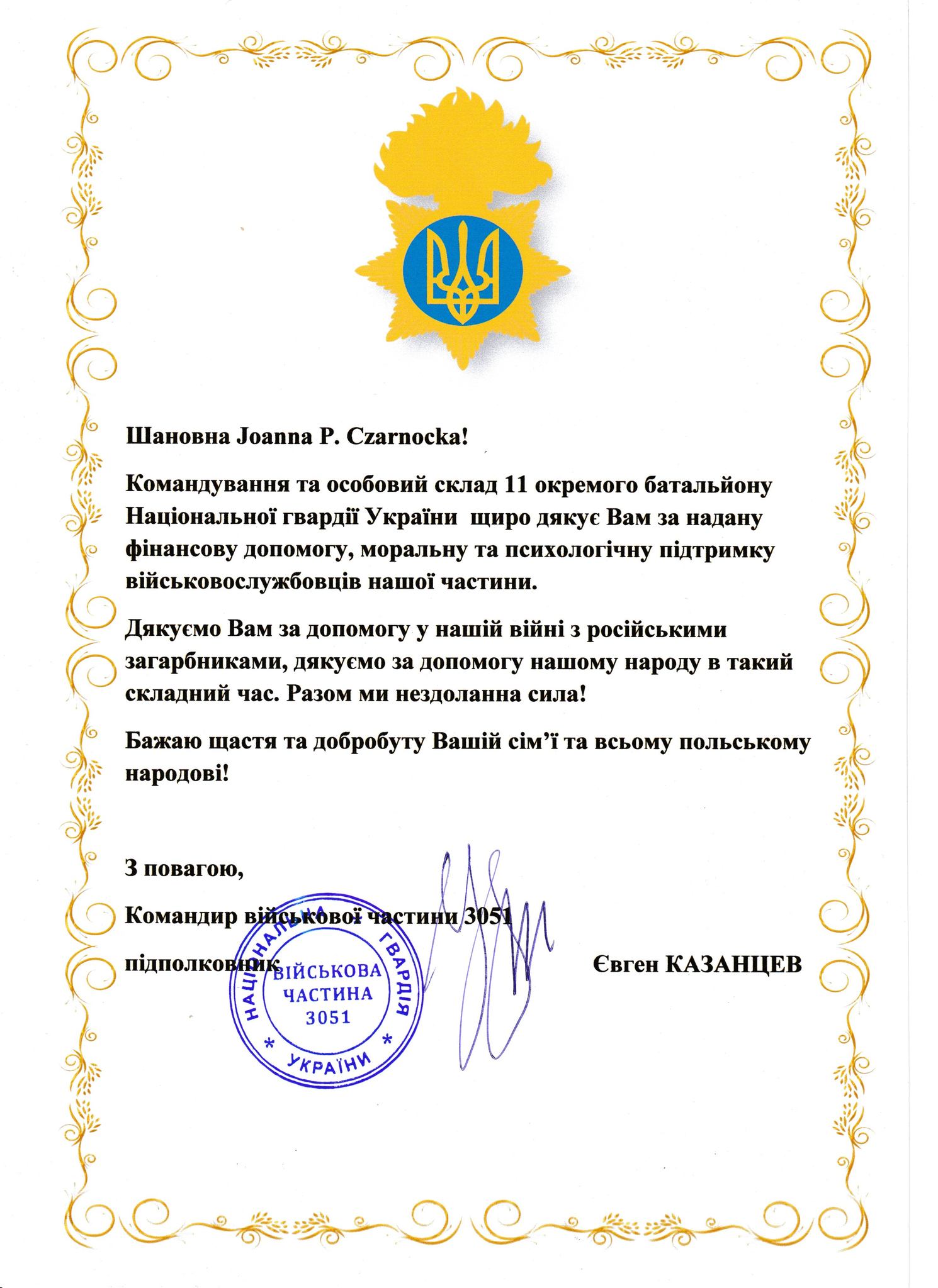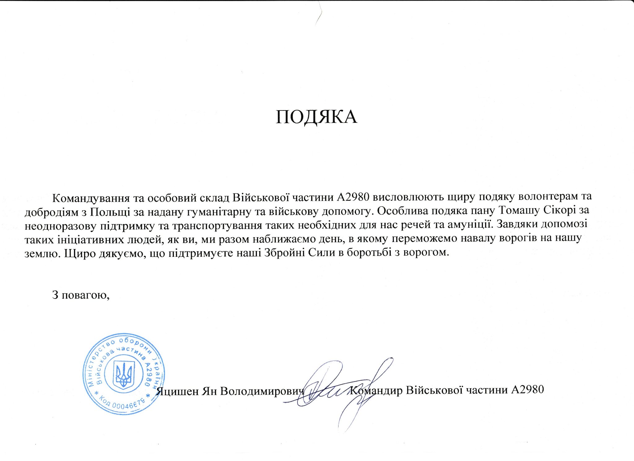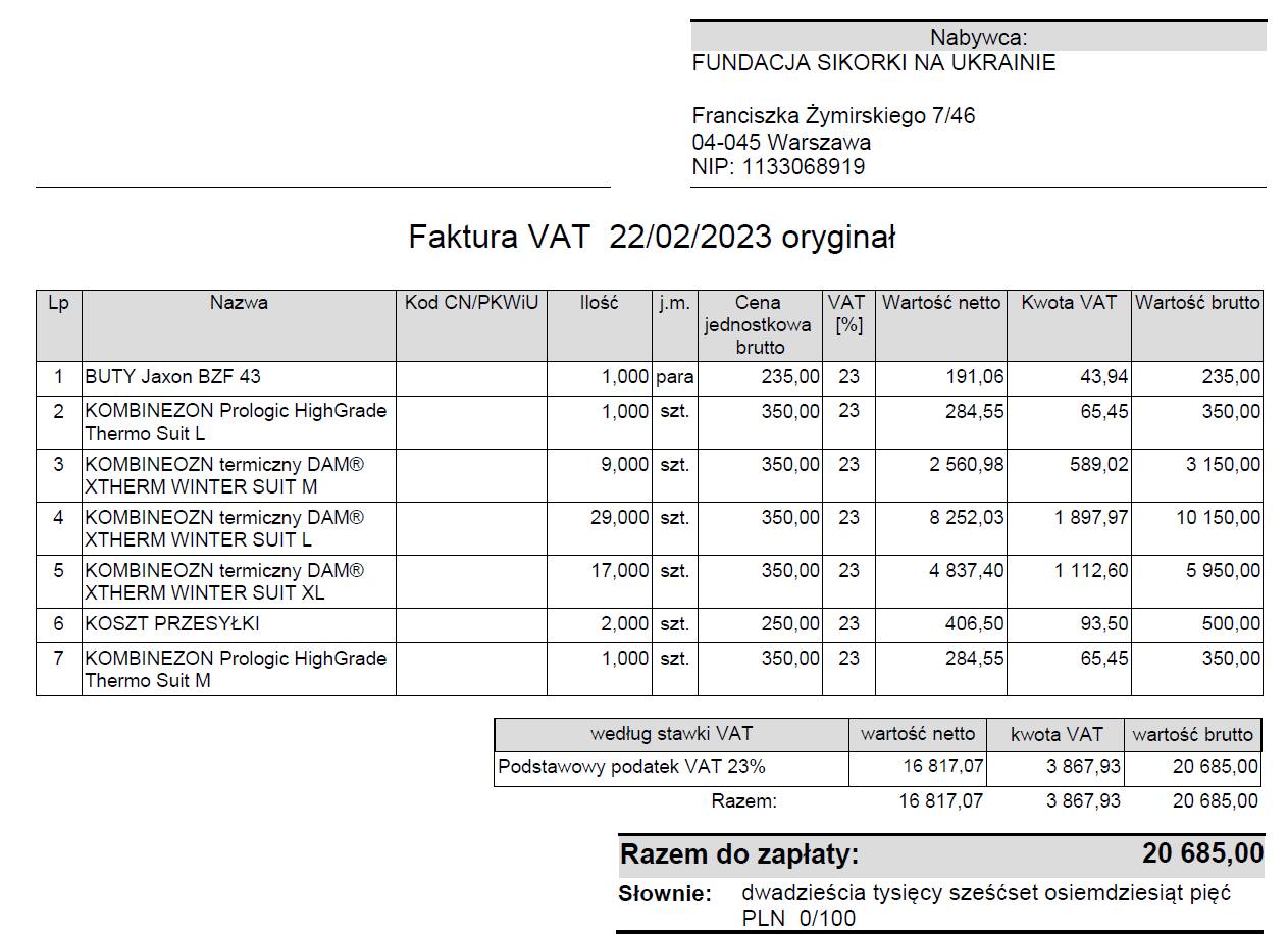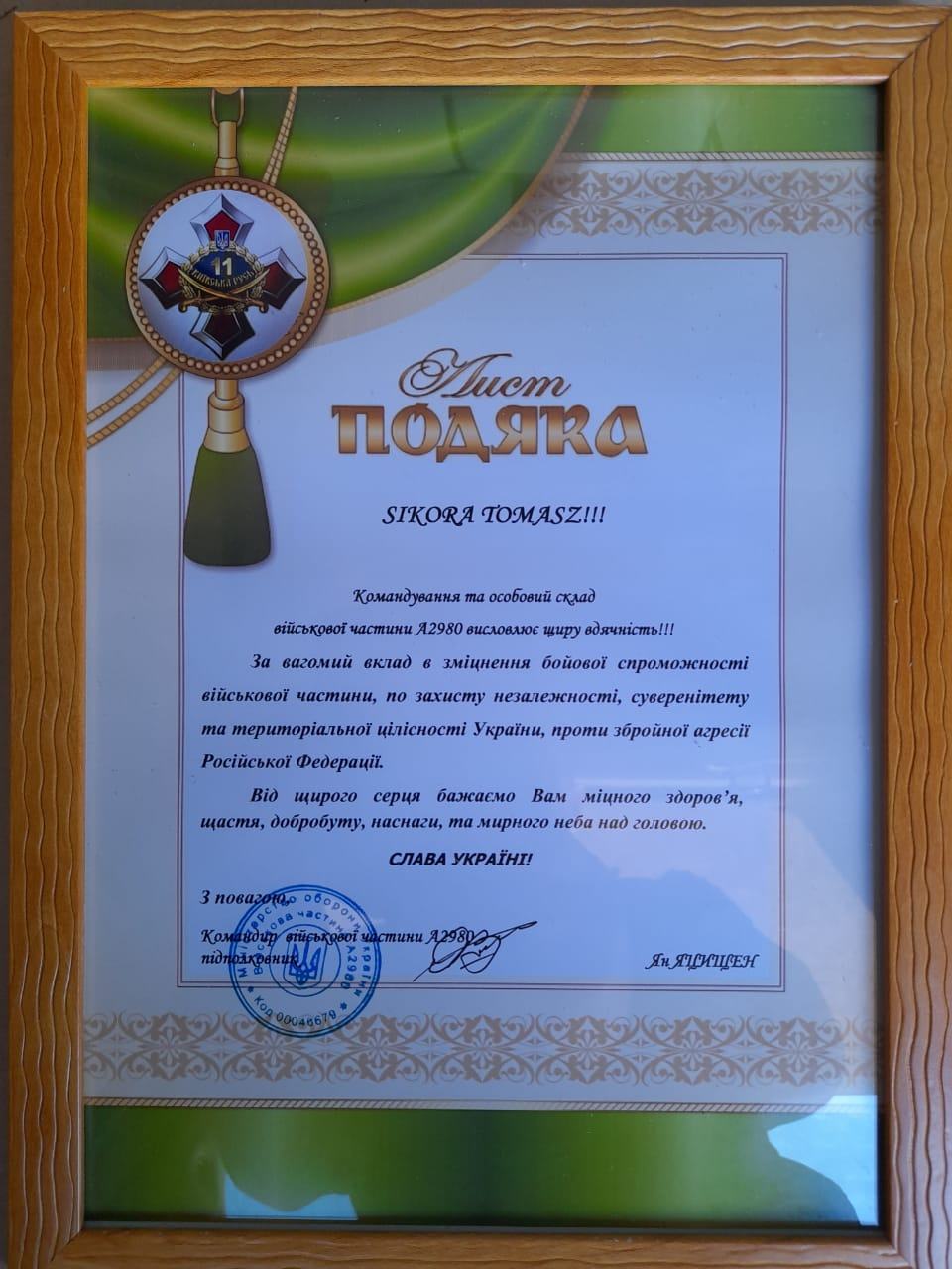 - Fundacji Sikorki na Ukrainie za pokrycie kosztów wszystkich części samochodowych potrzebnych dla uzdatnienia pracy tego auta na froncie, kosztów dostawy, ogarnięcie wszystkich papierów wojskowych i celnych, i przede wszystkim za łącznie darczyńców z walczącymi chłopakami.