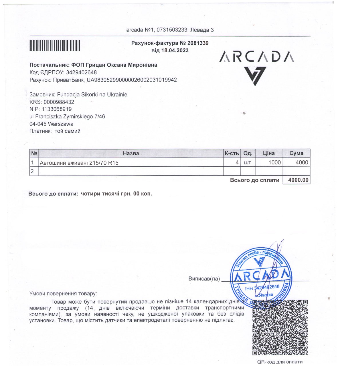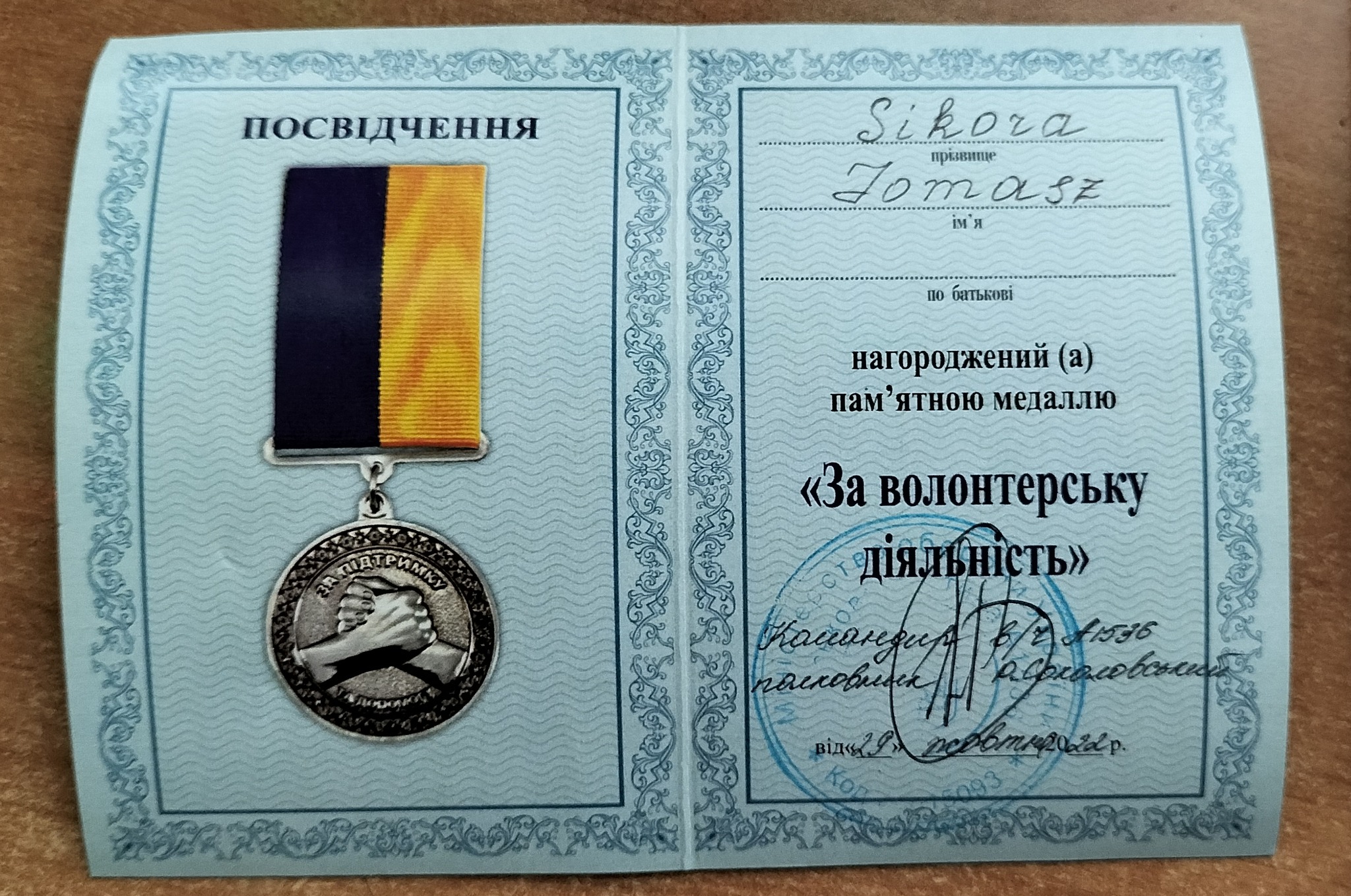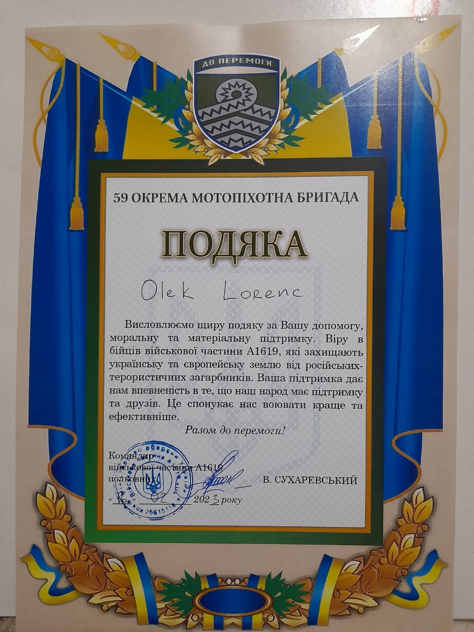 - Fundacji Sikorki na Ukrainie za pokrycie kosztów wszystkich części samochodowych potrzebnych dla uzdatnienia pracy tego auta na froncie, kosztów dostawy, ogarnięcie wszystkich papierów wojskowych i celnych, i przede wszystkim za łącznie darczyńców z walczącymi chłopakami.