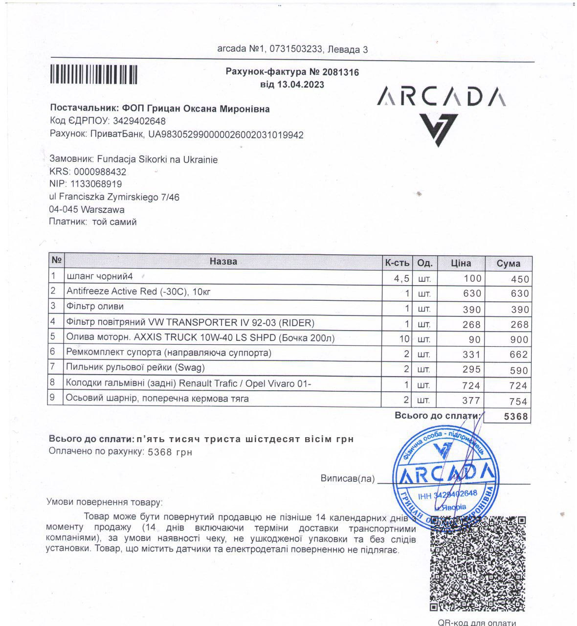 Dziś zapłaciliśmy za remont Grand Vitarki dostarczonej przez jedną organizację - faktura na zdjęciu.