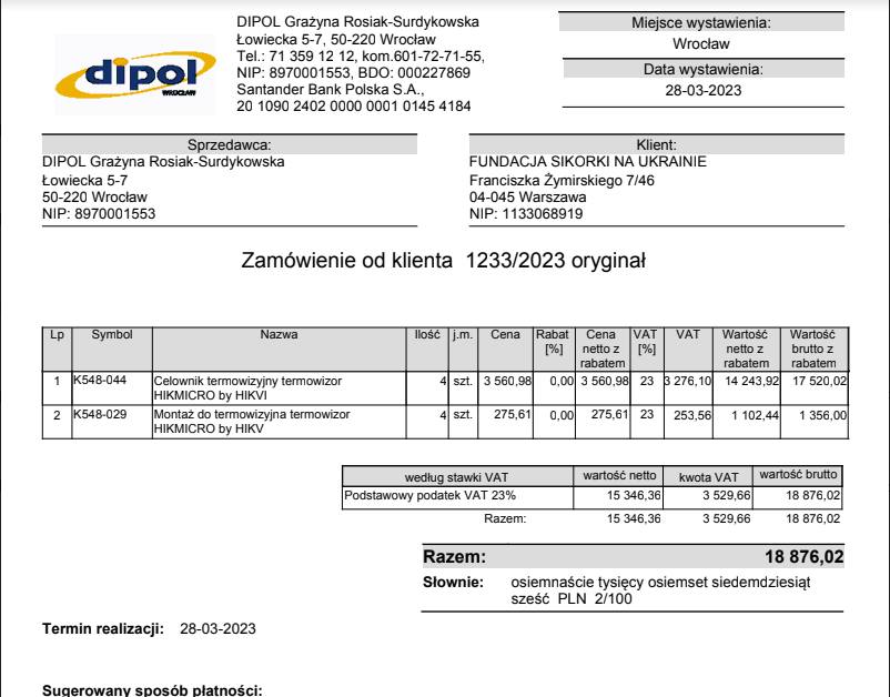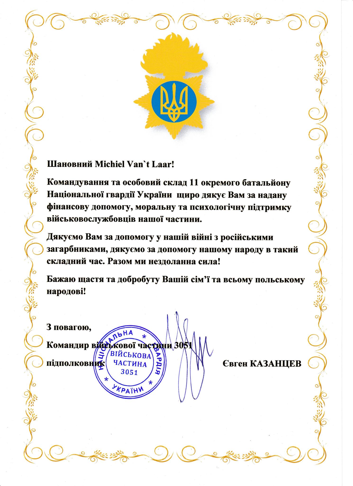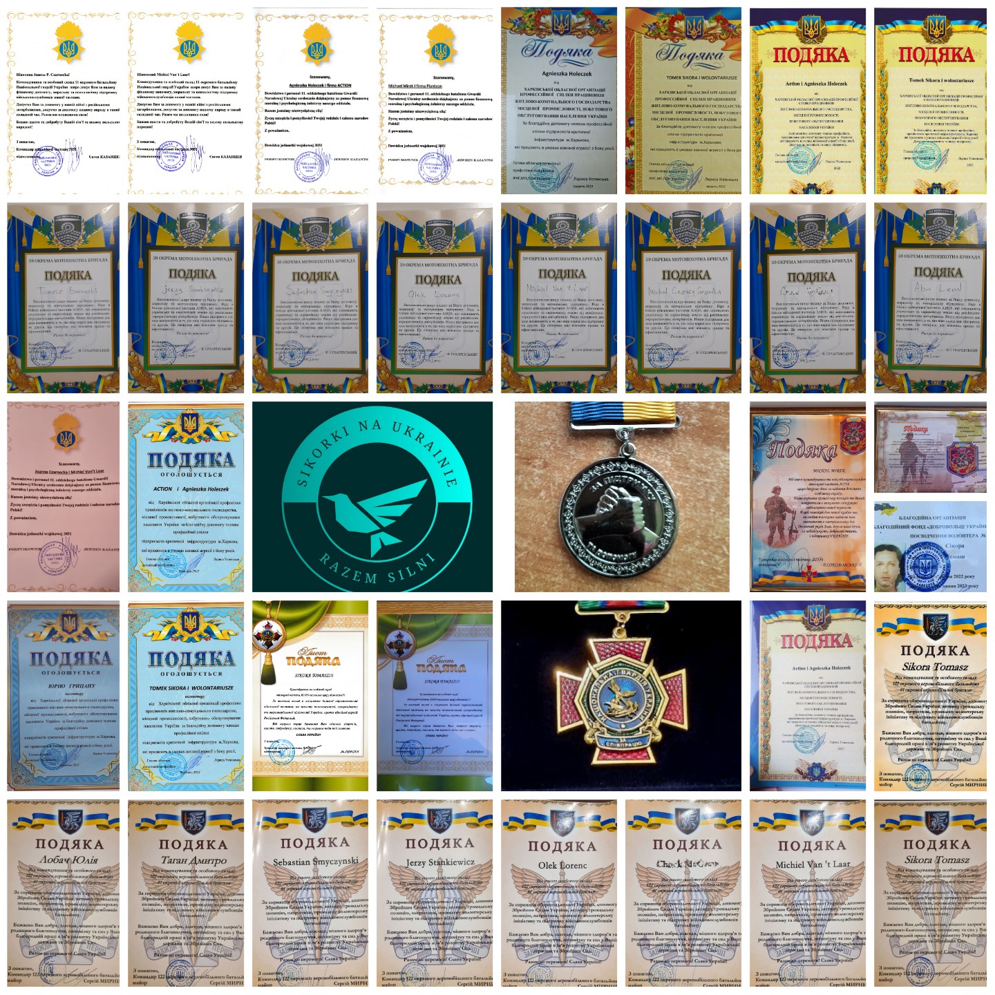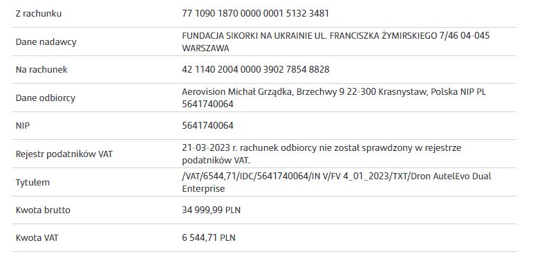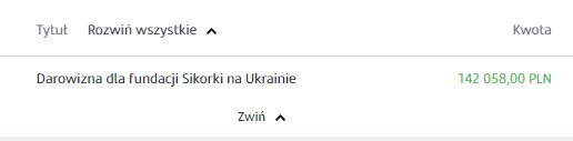 - Fundacji Sikorki na Ukrainie za pokrycie kosztów wszystkich części samochodowych potrzebnych dla uzdatnienia pracy tego auta na froncie, kosztów dostawy, ogarnięcie wszystkich papierów wojskowych i celnych, i przede wszystkim za łącznie darczyńców z walczącymi chłopakami.