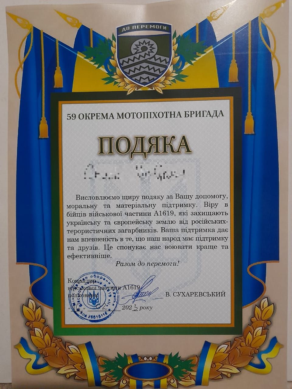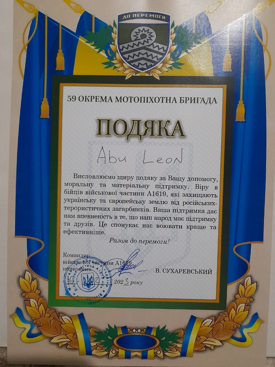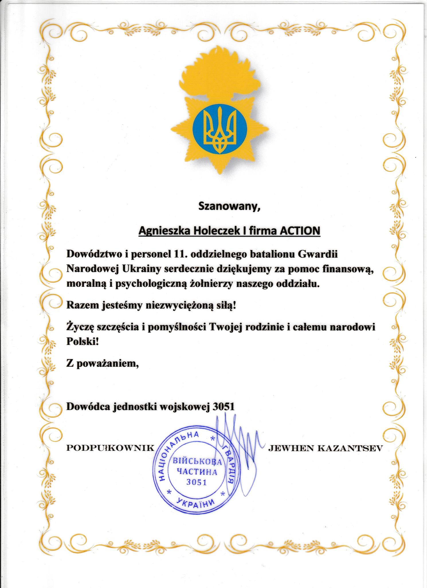 - Fundacji Sikorki na Ukrainie za pokrycie kosztów wszystkich części samochodowych potrzebnych dla uzdatnienia pracy tego auta na froncie, kosztów dostawy, ogarnięcie wszystkich papierów wojskowych i celnych, i przede wszystkim za łącznie darczyńców z walczącymi chłopakami.