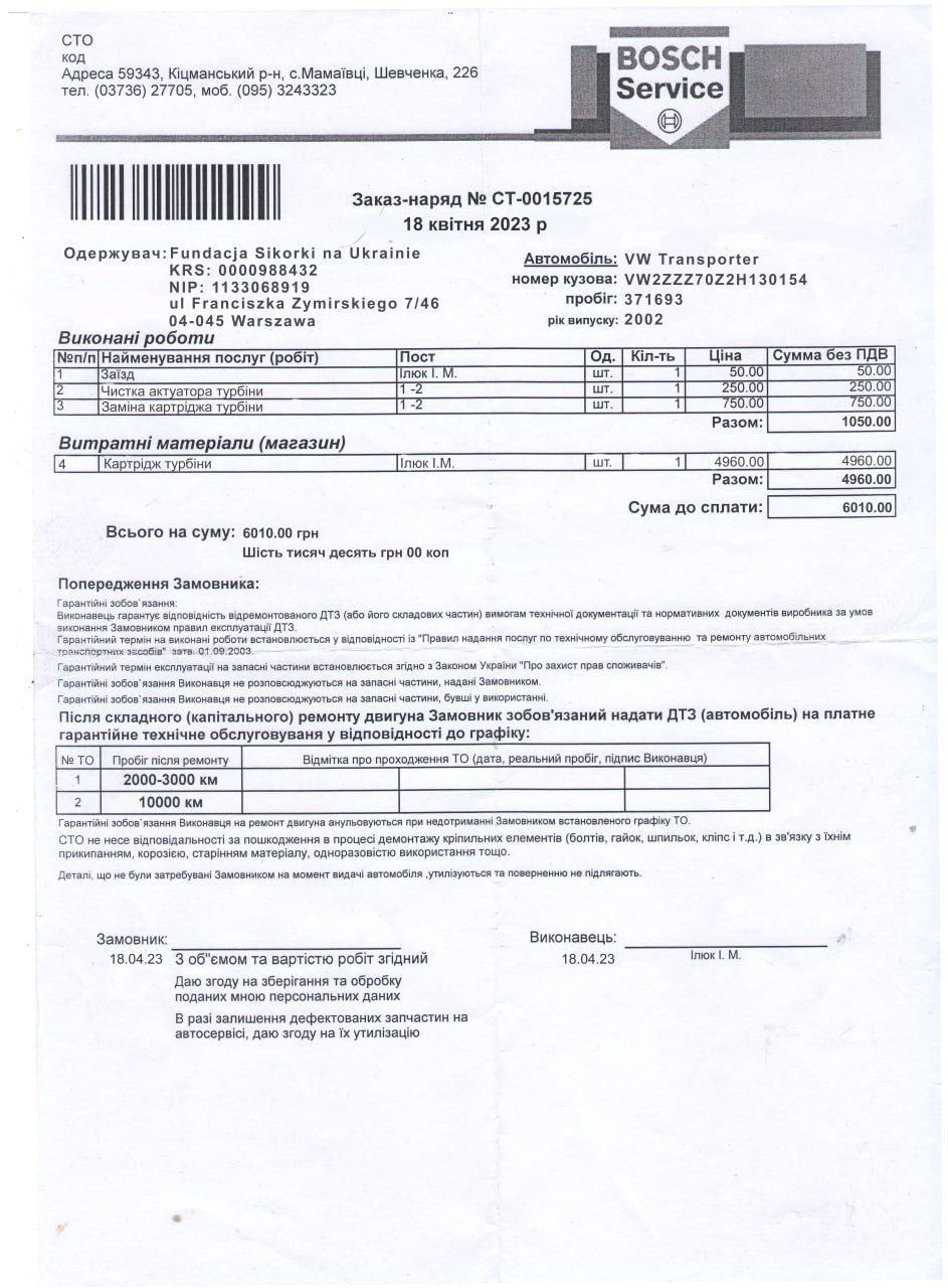 - Юрій Грицан za odebranie samochodu z Polski, własnoręczne naprawy mechaniczne i odstawienie go do chłopaków.